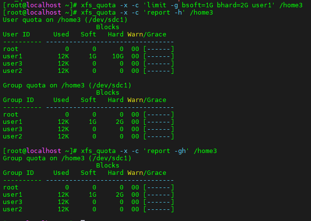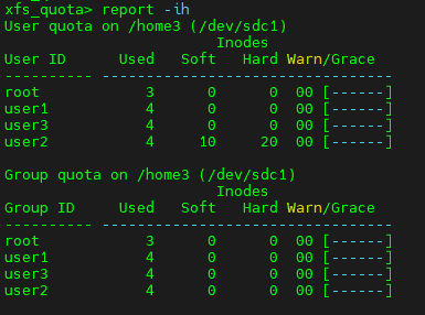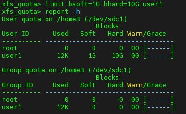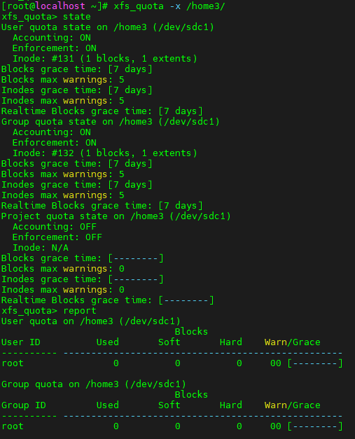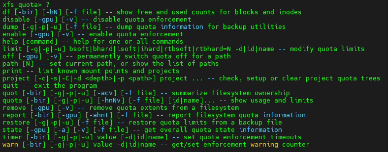 xfs_quota 명령어와 옵션 -x 를 이용하여 expert mode로 진입할 수 있다.