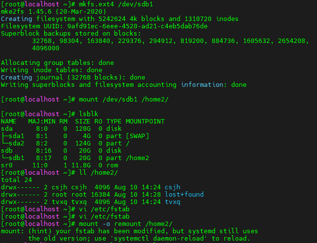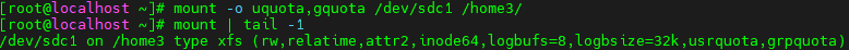 /dev/sdc 디스크를 추가하고 , xfs파일시스템으로 포맷한다. 그리고 마운트할 폴더 /home3를 만들어준다.