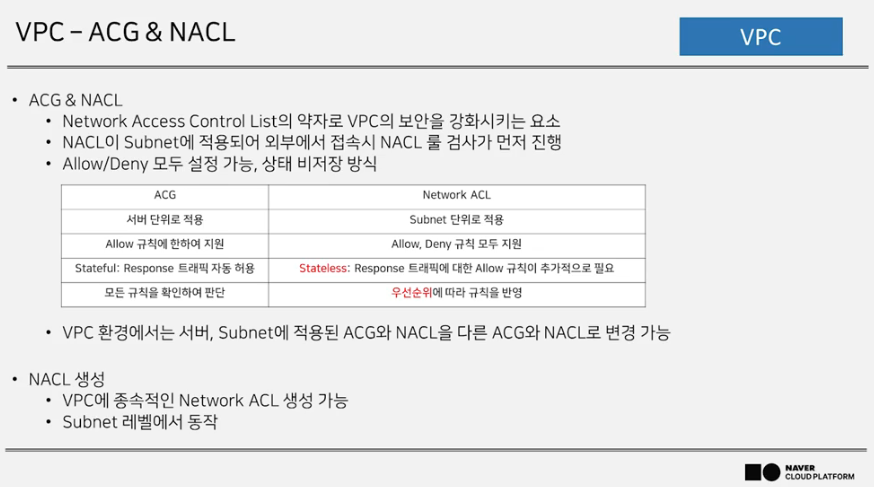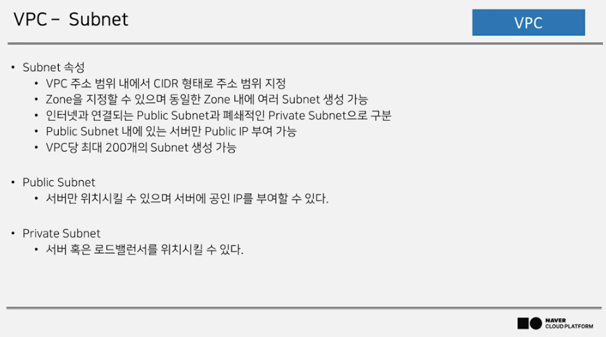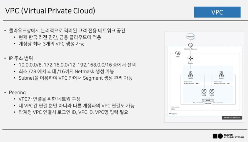 특징 : 한국 리전 민간, 금융 클라우드에 적용, 계정당 최대 3개의 VPC 생성 가능.